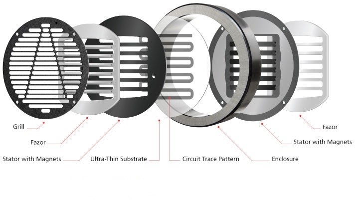 - 2. بلانار مغناطيسي – Planar Magnetic: محرك البلانار المغناطيسي هو ثاني محرك للسماعات في هذه السلسلة وتكلفته على الأرجح أغلى من المحرك الدايناميكي وحجمها أكبر على الأغلب وتتكون من شرائح معدنية مدعمة بمغناطيس من الجهتين ويكون تزويد الطاقة عبر شحنات كهربائية تغذي المغناطيس وينتشر على الشرائح المعدنية لتكوين تجربة صوتية أفضل. هذه صورة توضيحية لمحرك البلانار المغناطيسي والسماعات: