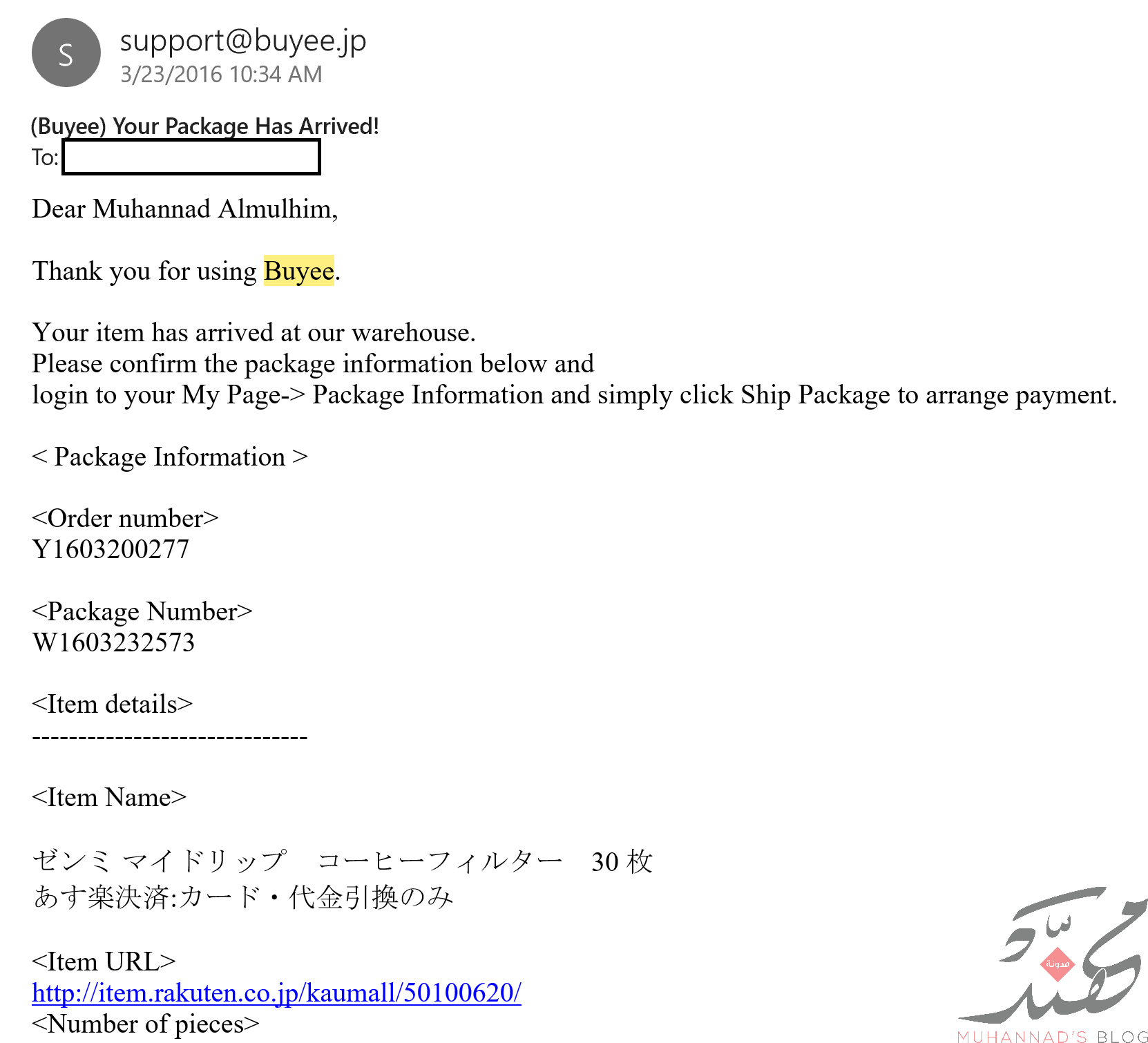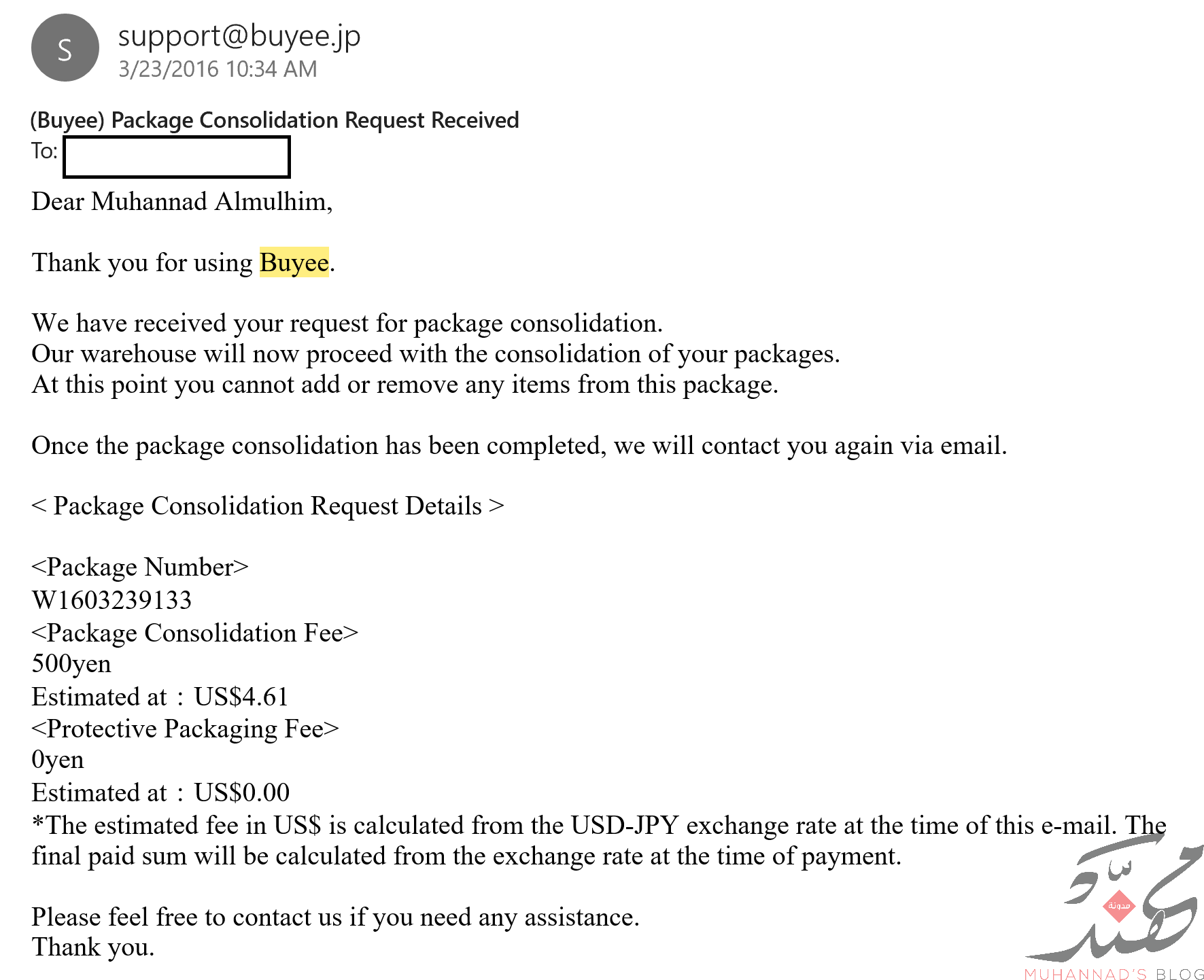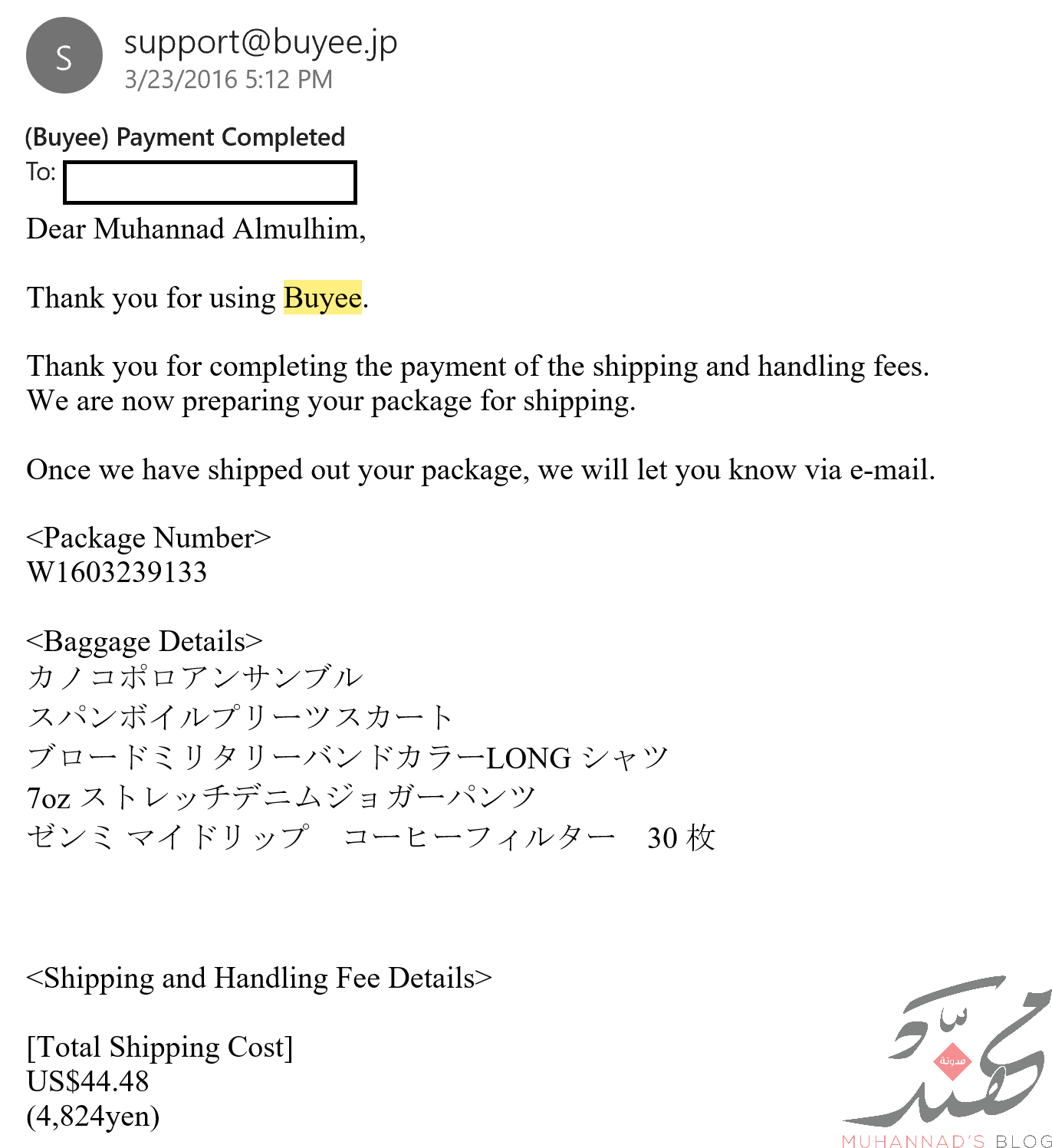 تنبيه: موقع Buyee الياباني يوفر خدمة الشراء عنك او بما تسمى خدمة الكونسييرج Concierge. بعد الشراء من الموقع سوف يقوم موقع Buyee بالشراء عنك وعند وصول الطلب لمستودعهم سوف يصلك بريد إلكتروني بذلك. بعدها بإمكانك تجميع الشحنات او طلب الشحن المباشر إلى السعودية.