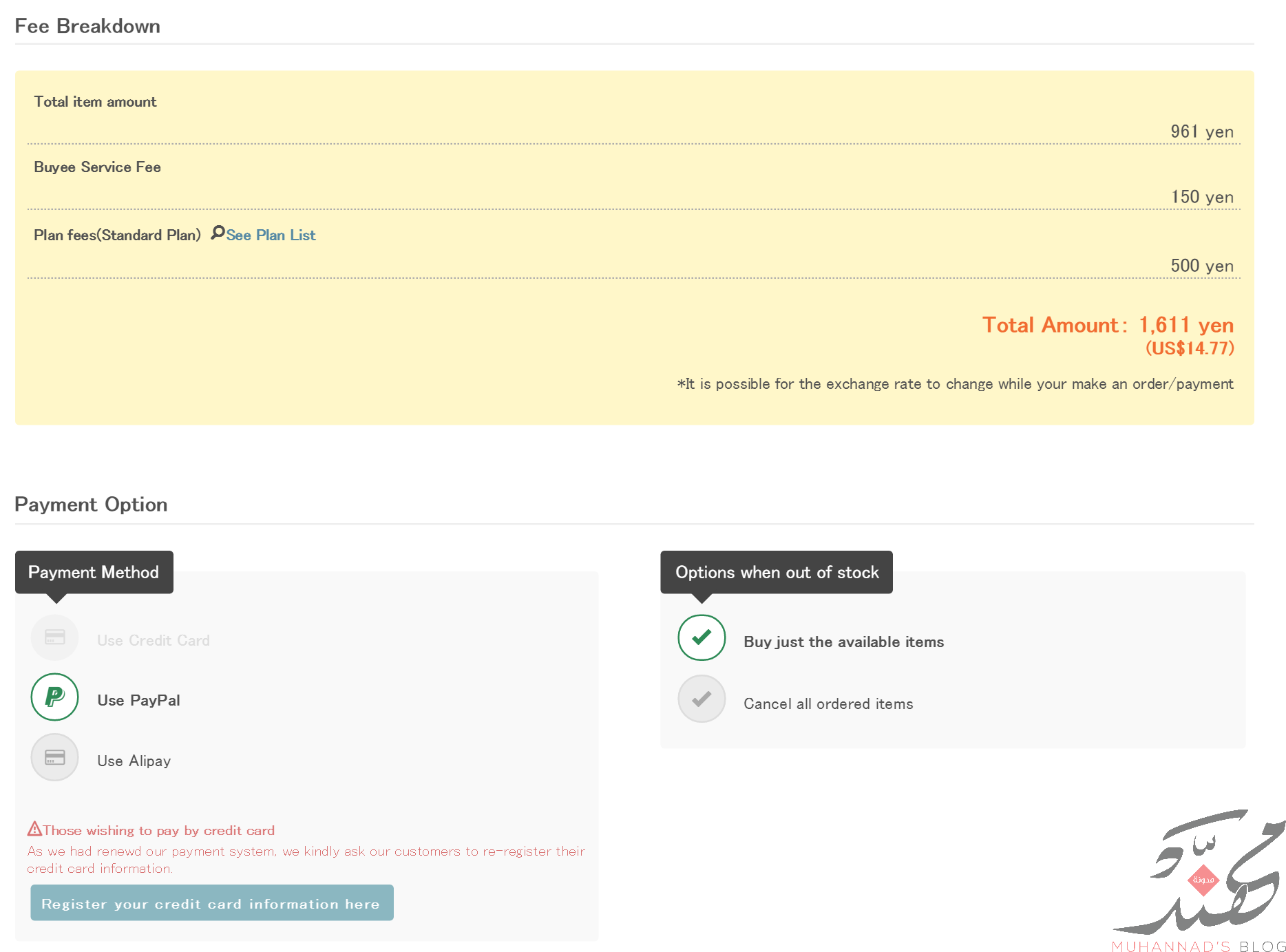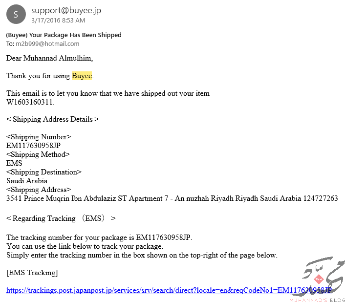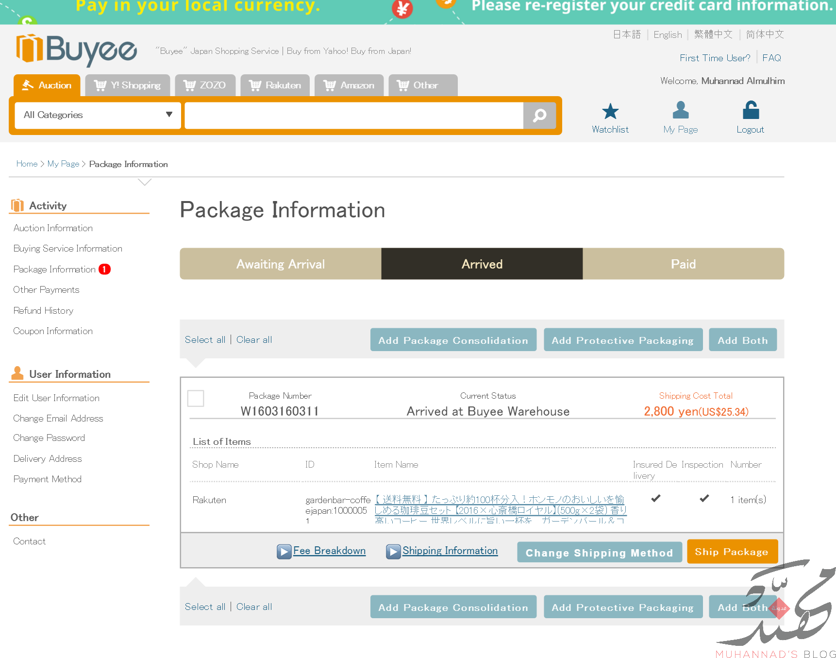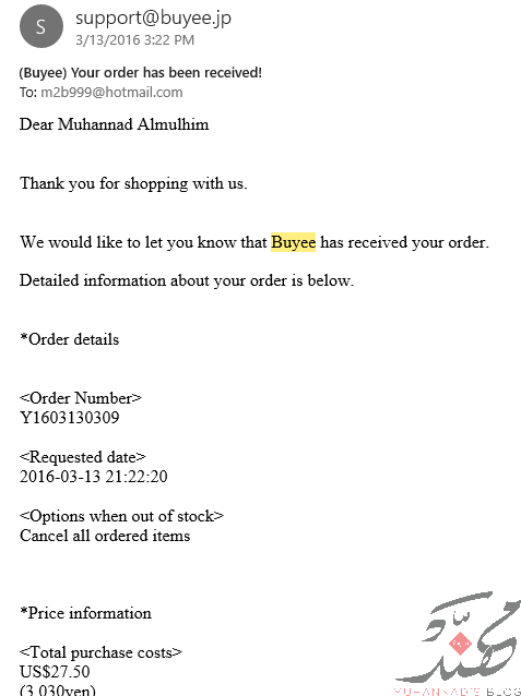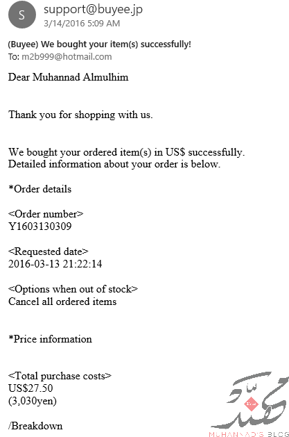 تنبيه: موقع Buyee الياباني يوفر خدمة الشراء عنك او بما تسمى خدمة الكونسييرج Concierge. بعد الشراء من الموقع سوف يقوم موقع Buyee بالشراء عنك وعند وصول الطلب لمستودعهم سوف يصلك بريد إلكتروني بذلك. بعدها بإمكانك تجميع الشحنات او طلب الشحن المباشر إلى السعودية.