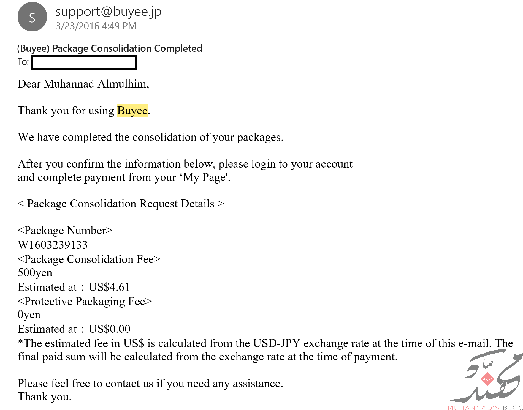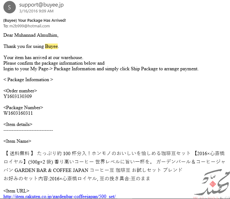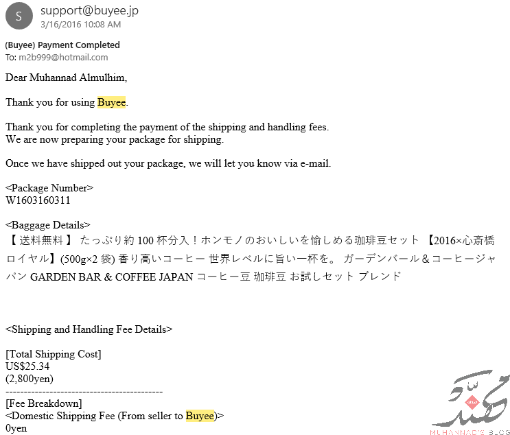 1- بعده وصول شحنتك إلى حسابك في موقع Buyee سوف يصلك بريد إلكتروني بوصول الشحنة لحسابك ومعلومات عنها (صورة 1).