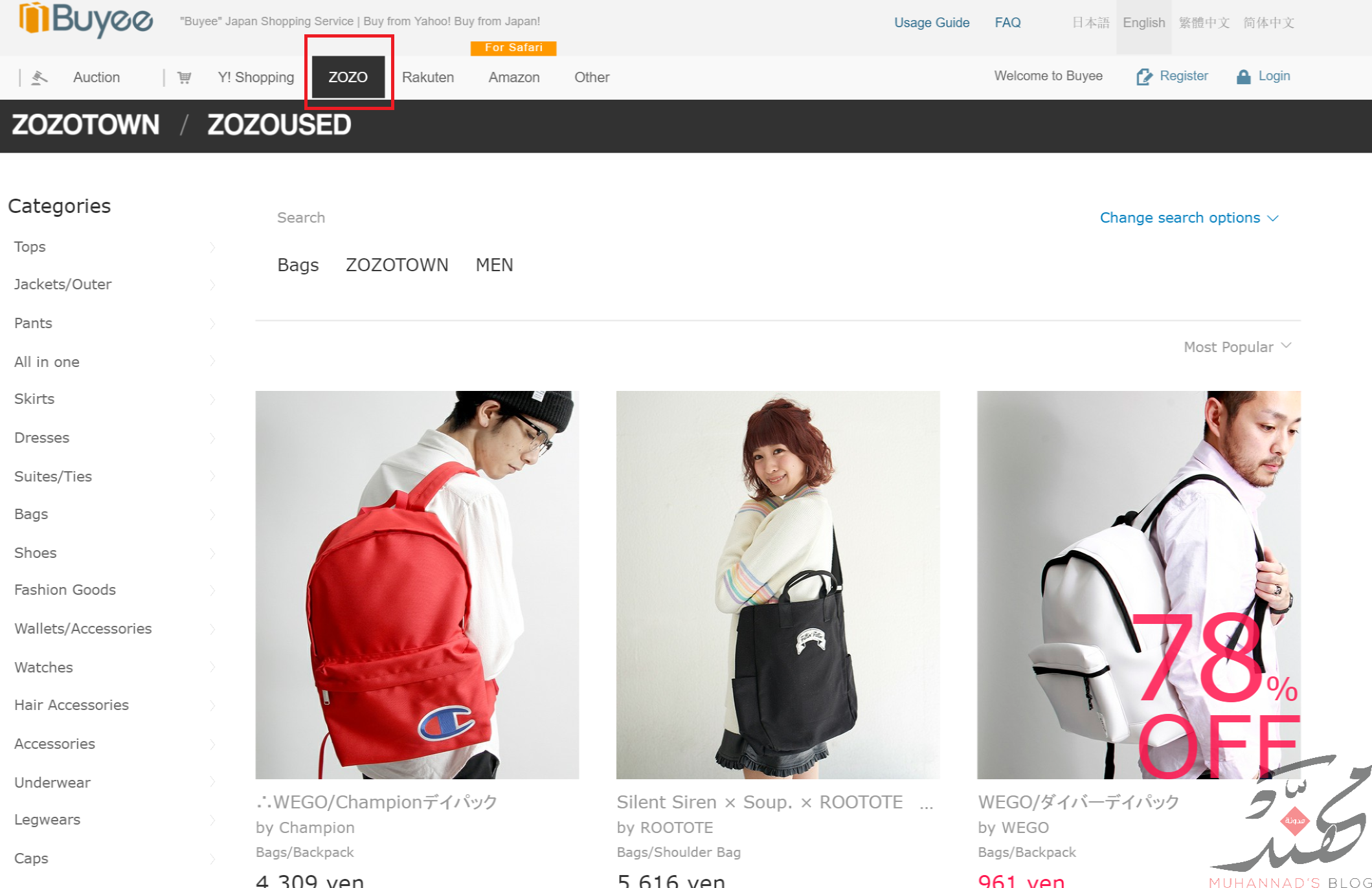 2- قم باختيار الموقع الذي تريد الشراء منه والبحث فيه عن طريق خانة البحث. مثلا أنا اخترت موقع ZOZOTOWN (صورة 2).