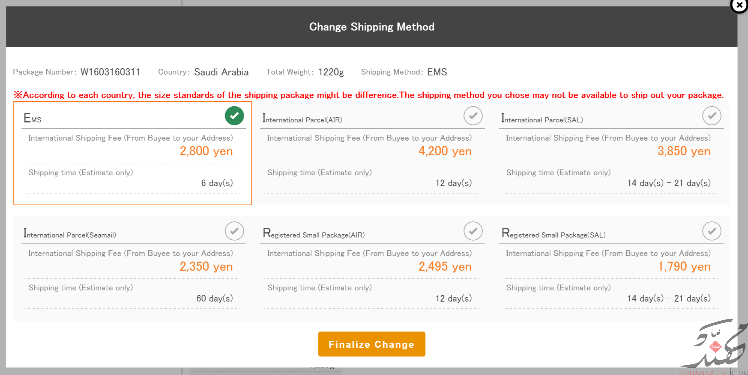 9- قم باختيار طريقة الشحن المناسبة وفي هذه الحالة يفضل خدمة EMS وهي البريد الممتاز عن طريق البريد الياباني والنقر على كلمة Finalize Change (صورة 9).