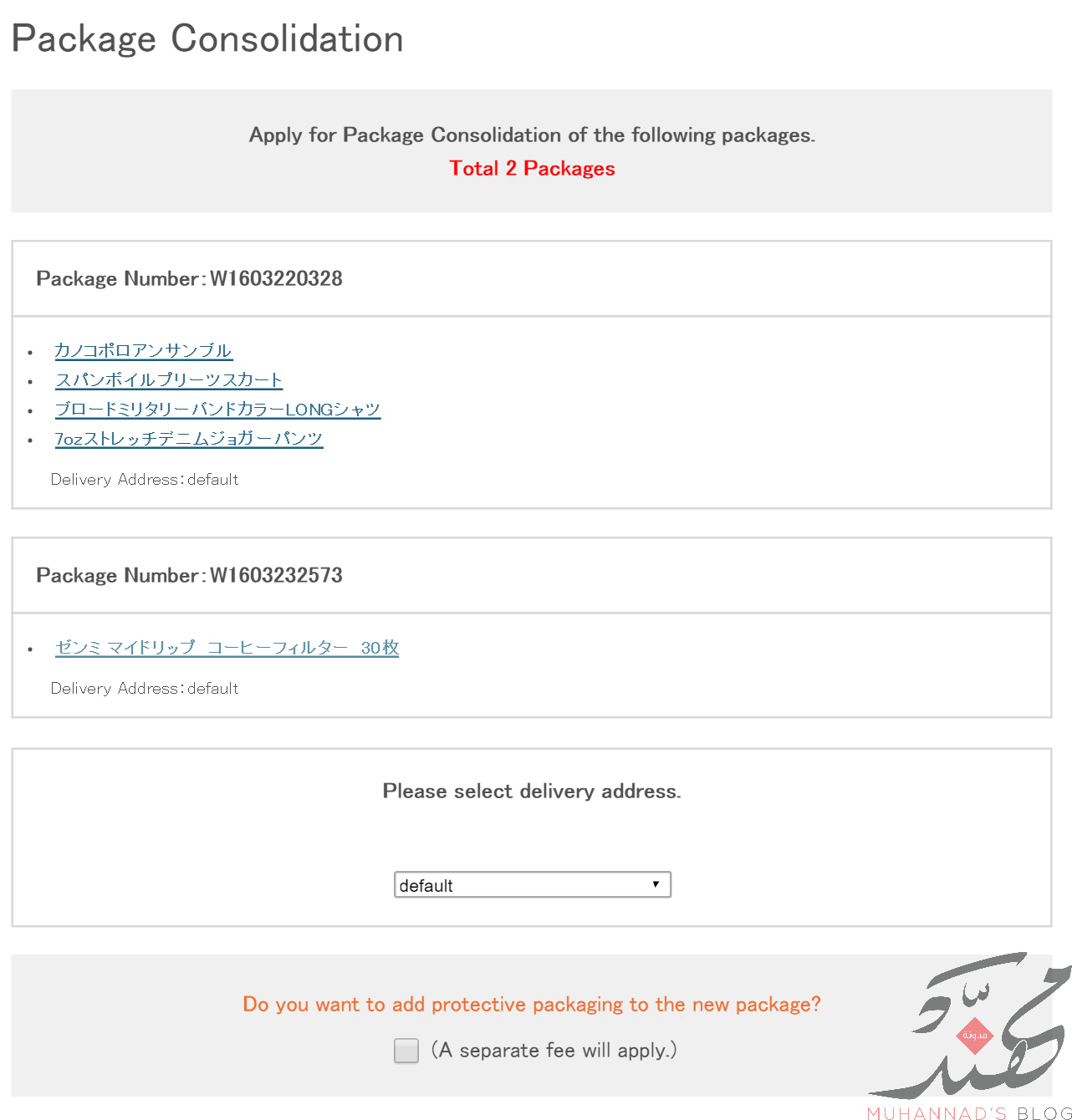 3- إذا قمت بشراء عدة منتجات وأردت أن تقوم بتجميع الشحنات قم بالنقر على كلمة Select All في الأعلى على اليسار ثم قم بالنقر على كلمة Add Package Consolidation من الشريط الأزرق في الأعلى أو الأسفل (صورة 3).