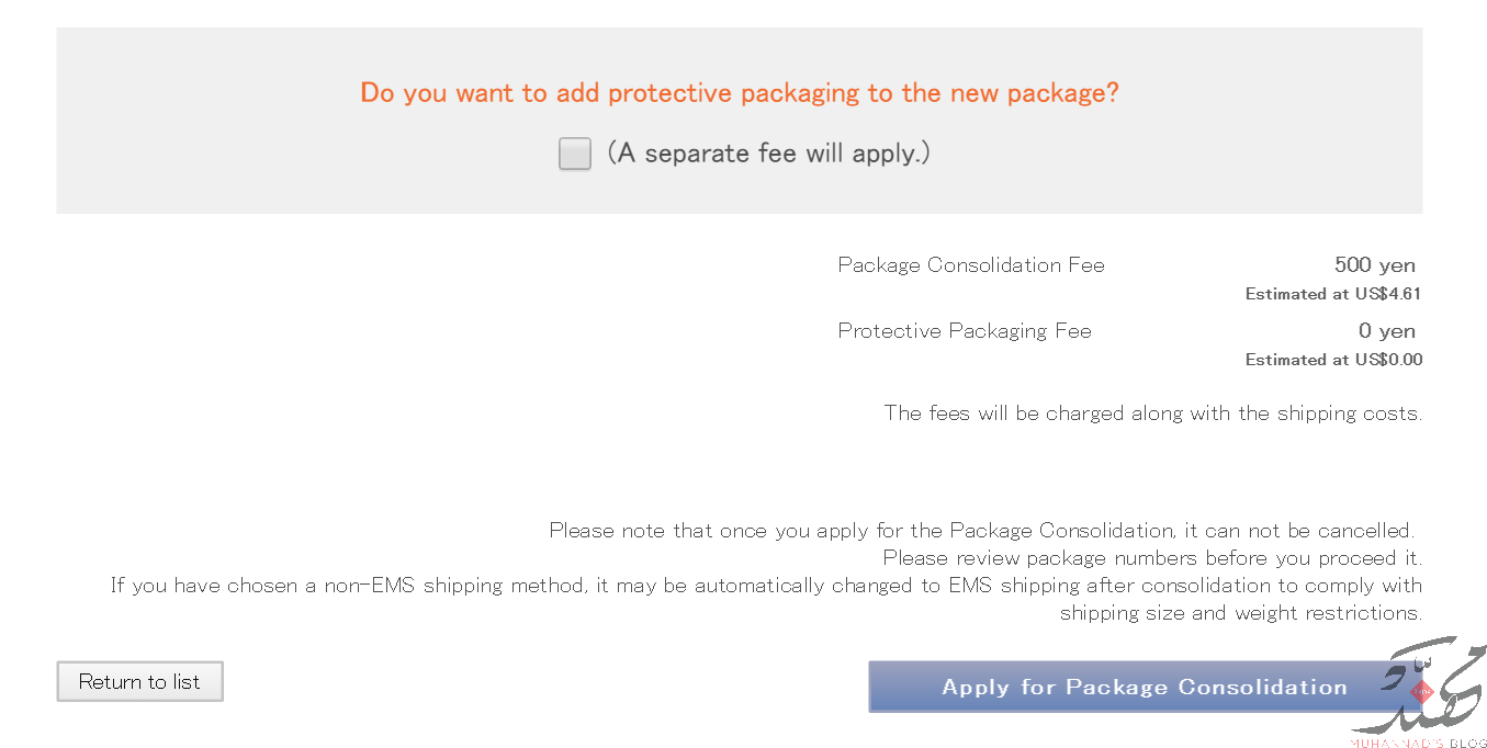 4- قم بالتأكد من الشحنات واختيار عنوان الشحن واذا ما أردت اضافة حماية للكرتون أم لا عبر وضع علامة صح على كلمة (A separate fee will apply.) (صورة 4 و 5).